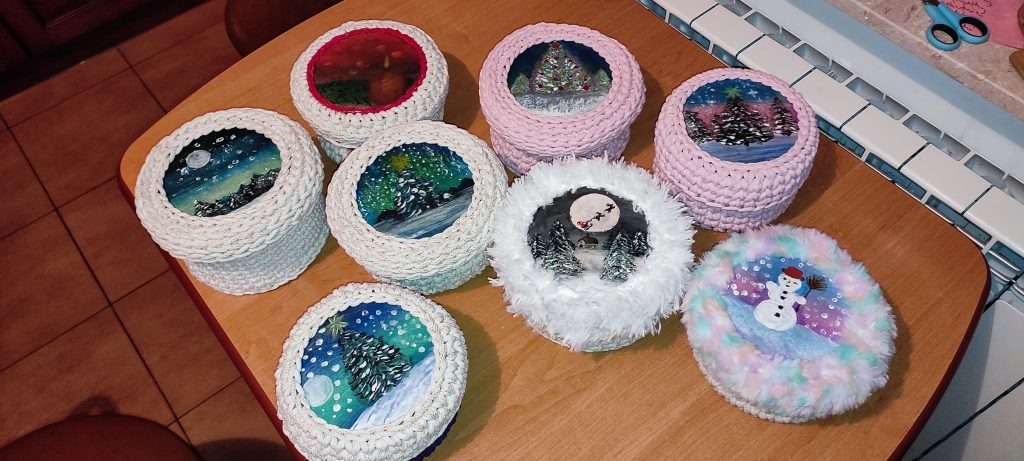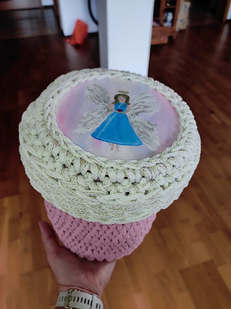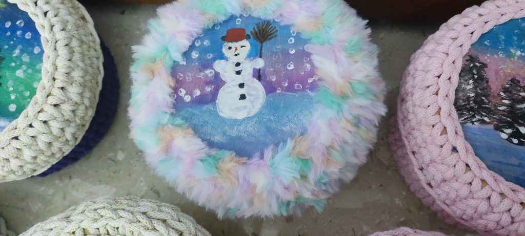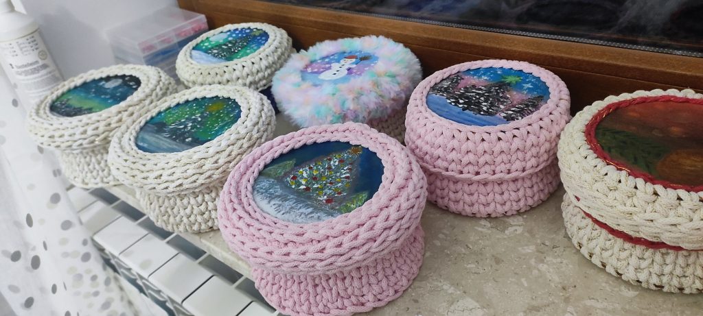 Na pokrywce maluję ręcznie wzór – czasem zimowy, czasem kwiatowy, czasem symboliczny – zawsze dopasowany do okazji i osoby, dla której koszyczek powstaje.